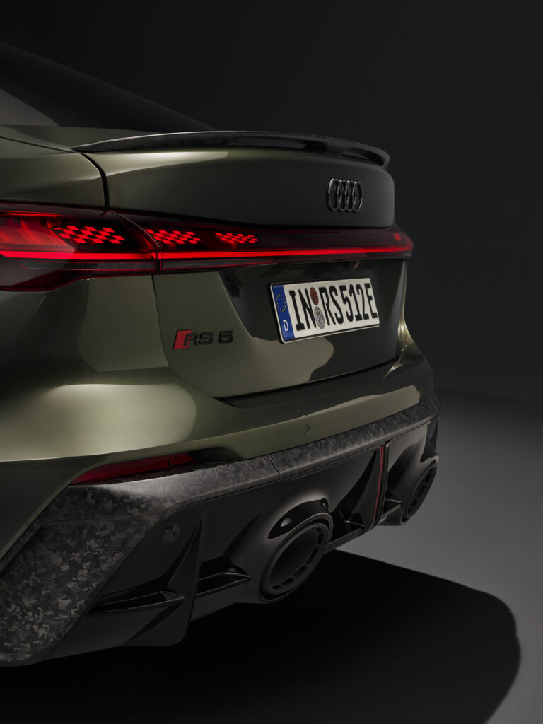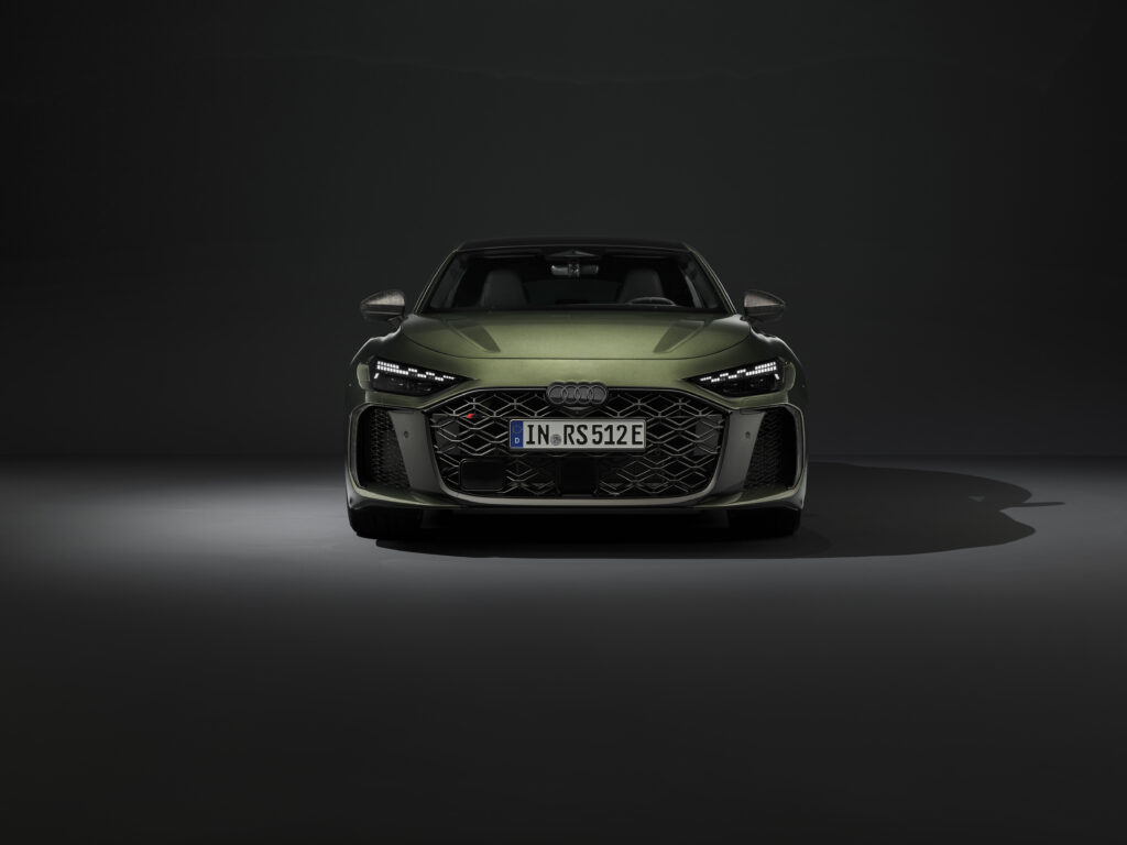 Das optionale Audi Sport Paket hebt die Sportlichkeit weiter. 21-Zoll-Bicolor-Räder, Phantom-Schwarz-Dekore, eine auf 285 km/h erhöhte Höchstgeschwindigkeit und die RS-Sportabgasanlage steigern die Performance sichtbar. Der Innenraum bietet erstmals Kontrastnähte in Serpentingrün und messingfarbene Akzente, ergänzt durch Carbon-Elemente.